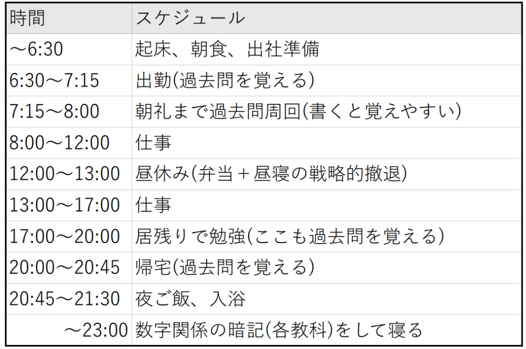 土日は資格学校に通ってました(仕事の時間に模試を解いたり、授業を見たりする感じ)