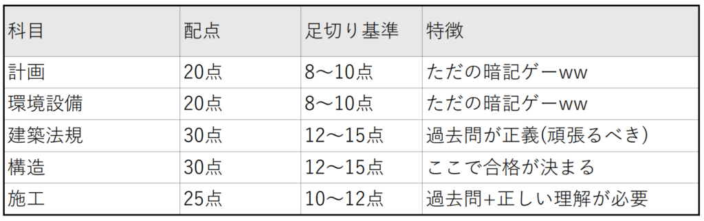 これに得意教科を+5点(施工で18点を目指すとか、環境設備で16点を目指すとか、、、)